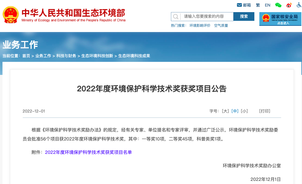 據了解,環境保護科學技術獎是中國環保科技領域最高獎項,是根據國家科學技術獎勵工作辦公室公告而設立的環保類獎項,旨在獎勵在環境保護科學技術活動中做出突出貢獻的單位和個人,2003年首次頒發至今,對推動經濟發展和社會進步有重大意義和作用的項目。本次共批準56個項目,其中:一等獎10項,二等獎45項,科普類獎1項。